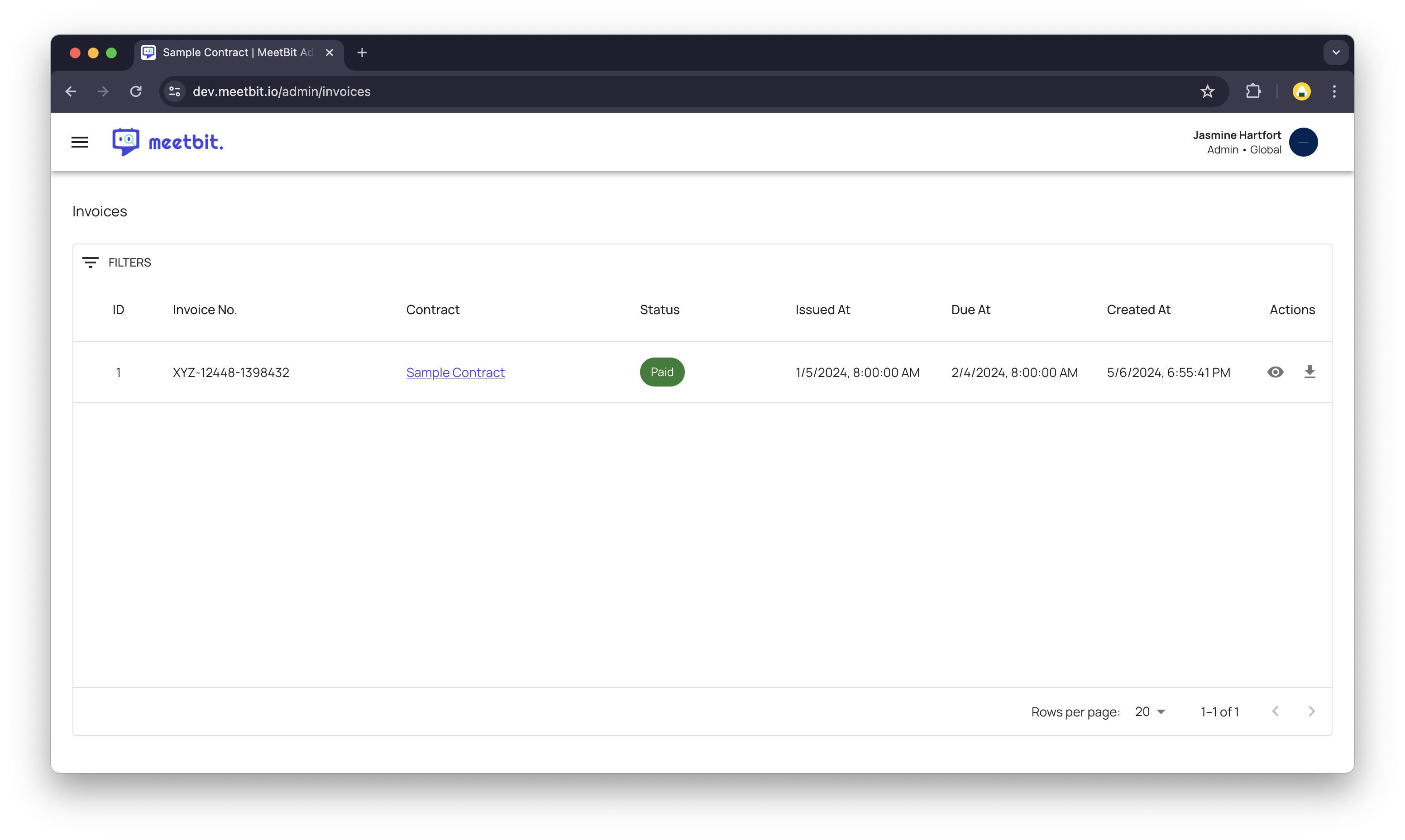 MeetBit provides a dedicated page for accessing Invoices issued by MeetBit to the Workspace.