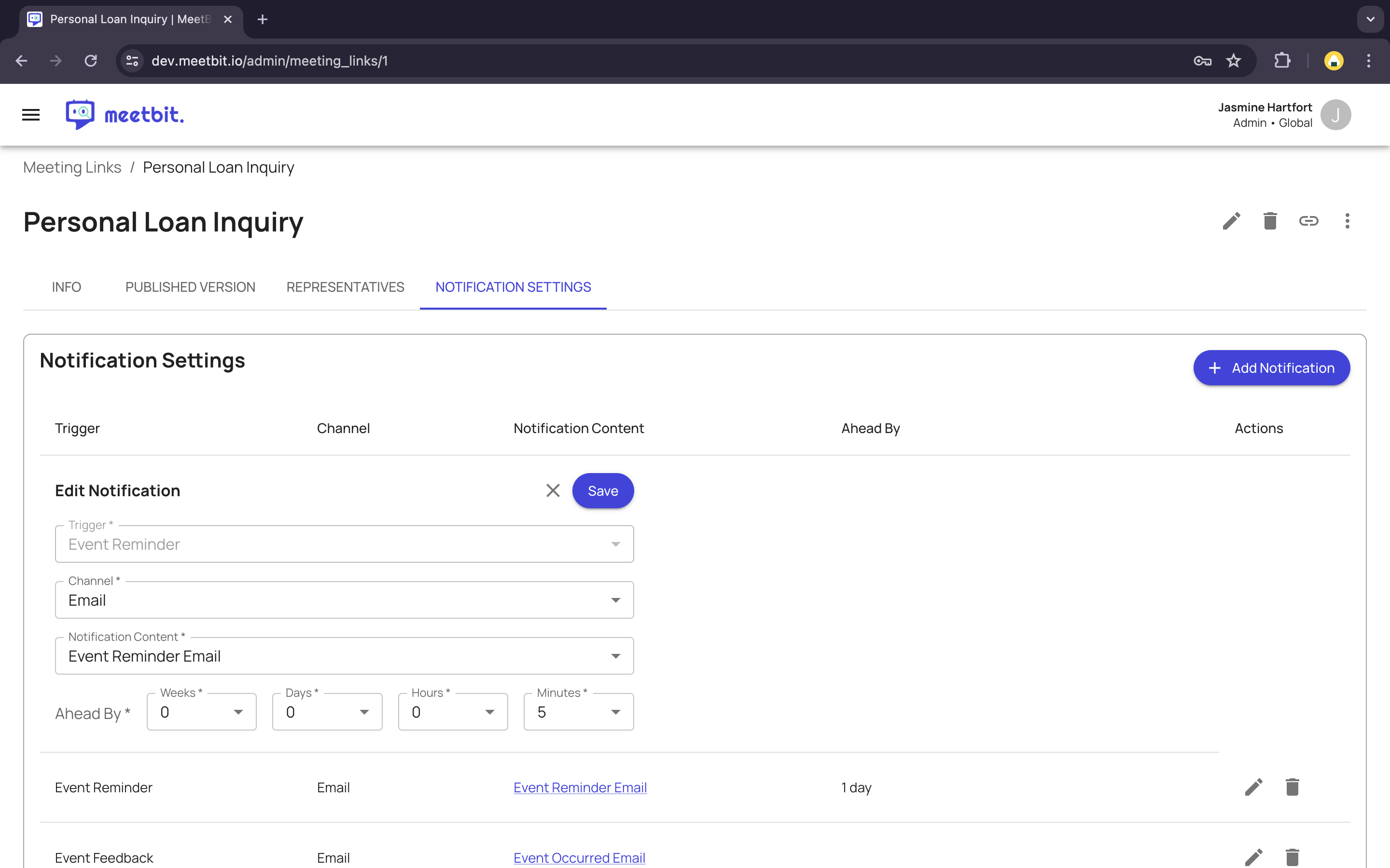 1. On the Meeting Link's page, click the "Notification Settings" tab.