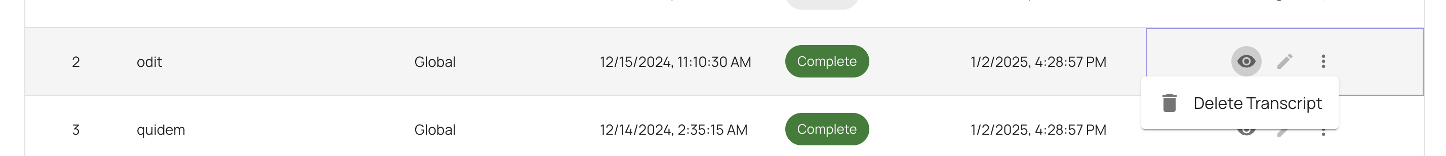 <figure><img src="https://91127013-files.gitbook.io/~/files/v0/b/gitbook-x-prod.appspot.com/o/spaces%2F6B5cn0CbIbT4a4yvlffa%2Fuploads%2FdVNUhHR8p2oiRWqHsK0U%2FScreenshot%202025-07-06%20at%2001.31.23.png?alt=media&#x26;token=036b72b5-4464-4849-8a17-e2dea8ac6d2e" alt=""><figcaption><p>Delete Transcript Button on the Transcripts Page</p></figcaption></figure>