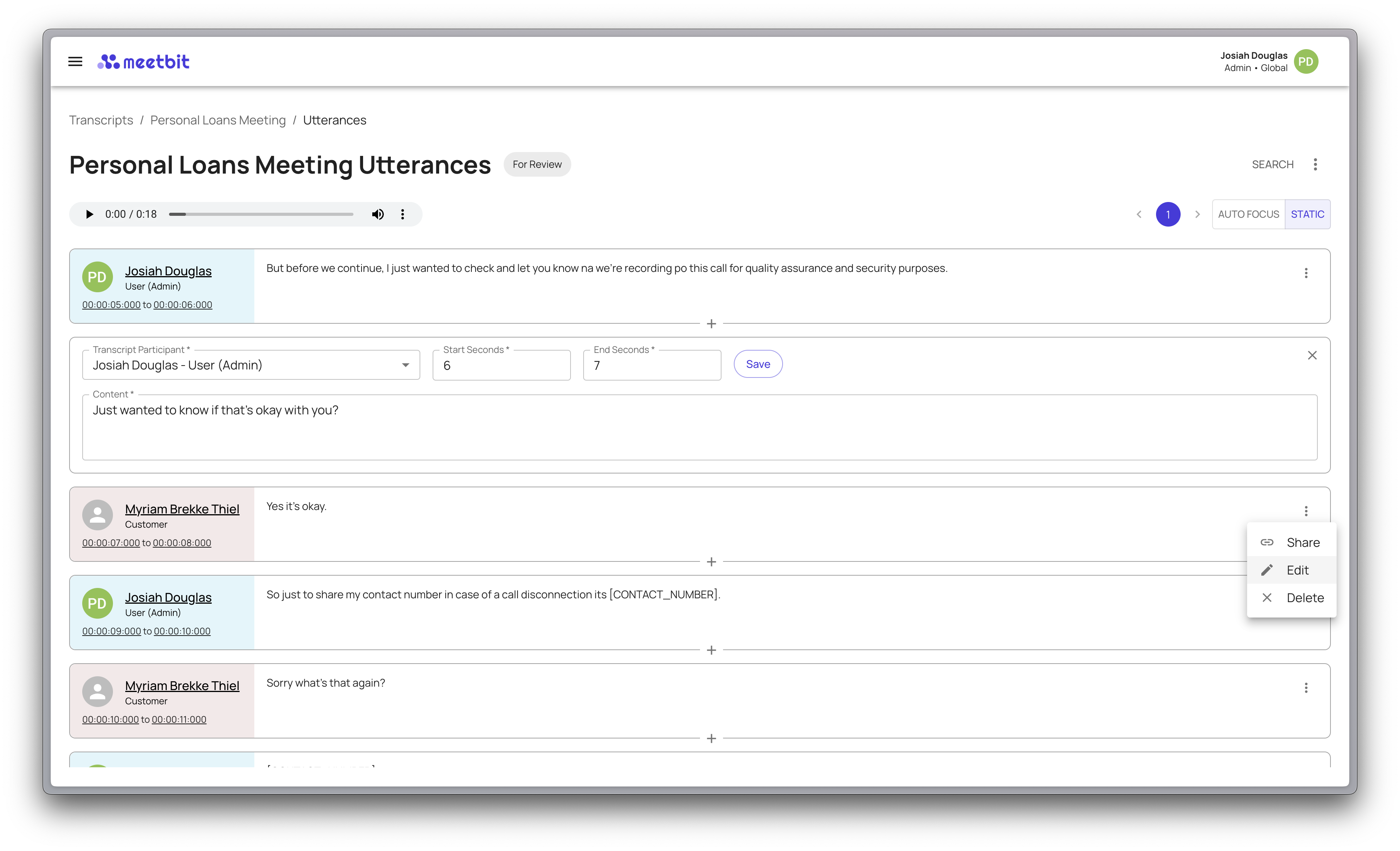 Though uncommon, MeetBit Transcriptions may include mistakes and **we recommend that you manually review transcripts before completing them**. Reviewing allows you to fix any mistakes made by MeetBit which may include: