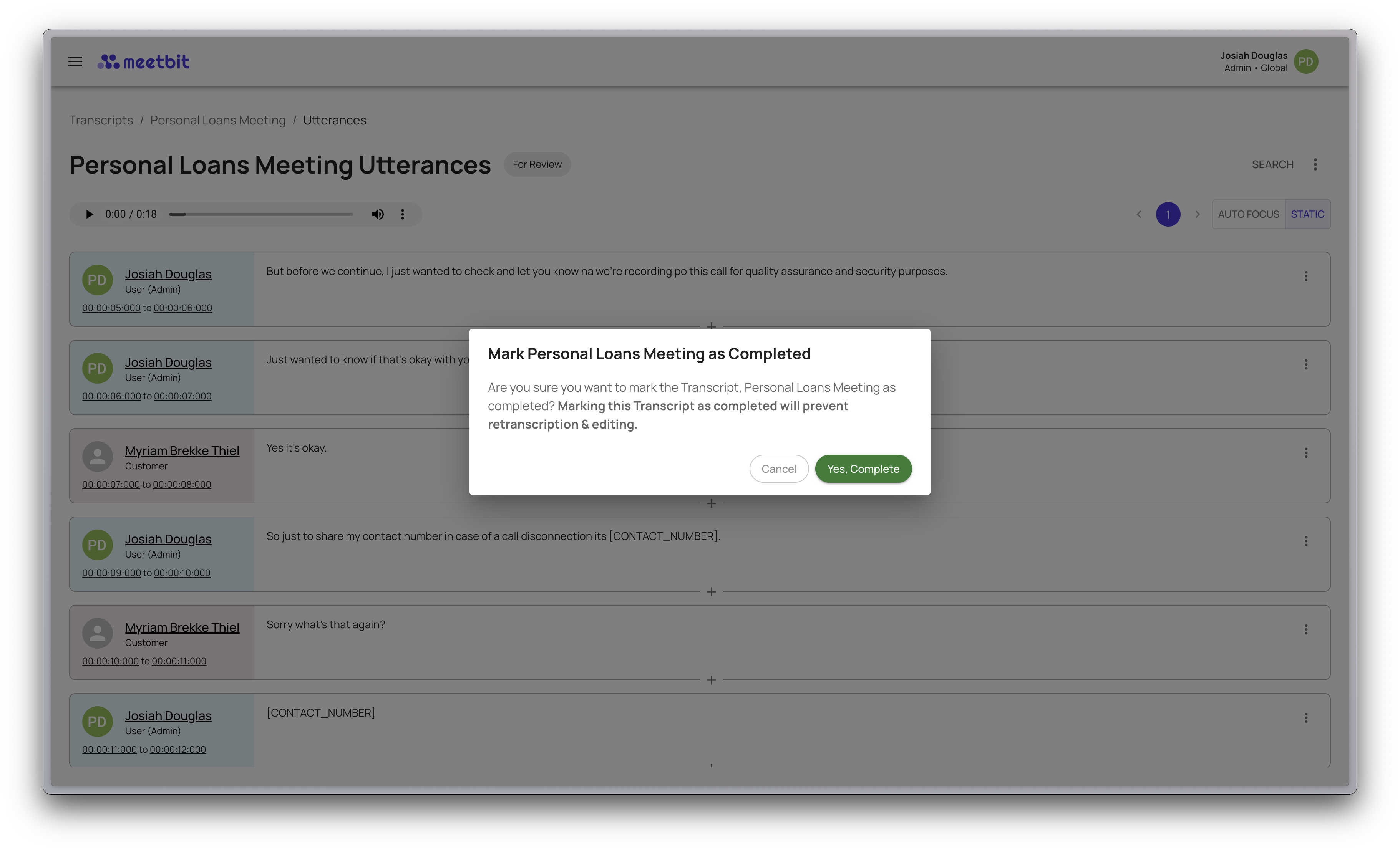 After reviewing a Transcript's Utterances and you have ensured its accuracy, marking the Transcript as completed ensures that you or other users do not mistakenly update it in the future.